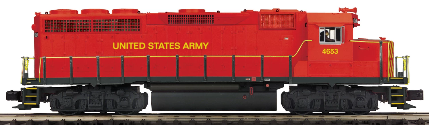 This is a MTH 20-20577-1 O Scale U.S. Army GP-40 Diesel Engine with Proto-Sound 3.0 (Hi-Rail Wheels) #4653. It Features: Intricately Detailed Durable ABS Body,Die-Cast Truck Sides, Pilots and Fuel Tank,Metal Chassis,Metal Handrails and Horn,Moveable Roof Fans,Metal Body Side Grilles,Detachable Snow Plow,(2) Handpainted Engineer Cab Figures,Authentic Paint Scheme,Metal Wheels, Axles and Gears,O Scale Kadee-Compatible Coupler Mounting Pads,Prototypical Rule 17 Lighting,Directionally Controlled Constant voltage LED Headlights,Lighted LED Cab Interior Light,Illuminated LED Number Boards,Lighted LED Marker Lights,(2) Precision Flywheel-Equipped Motors,Operating ProtoSmoke Diesel Exhaust,Onboard DCC/DCS Decoder,Locomotive Speed Control In Scale MPH Increments,Proto-Scale 3-2 3-Rail/2-Rail Conversion Capable,1:48 Scale Proportions,Proto-Sound 3.0 With The Digital Command System Featuring: Freight Yard Proto-Effects,Unit Measures:15 1/2 x 2 3/4 x 4 and Operates On O-31 Curves.