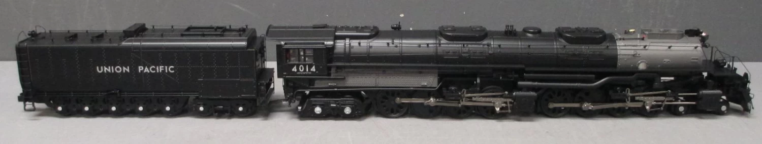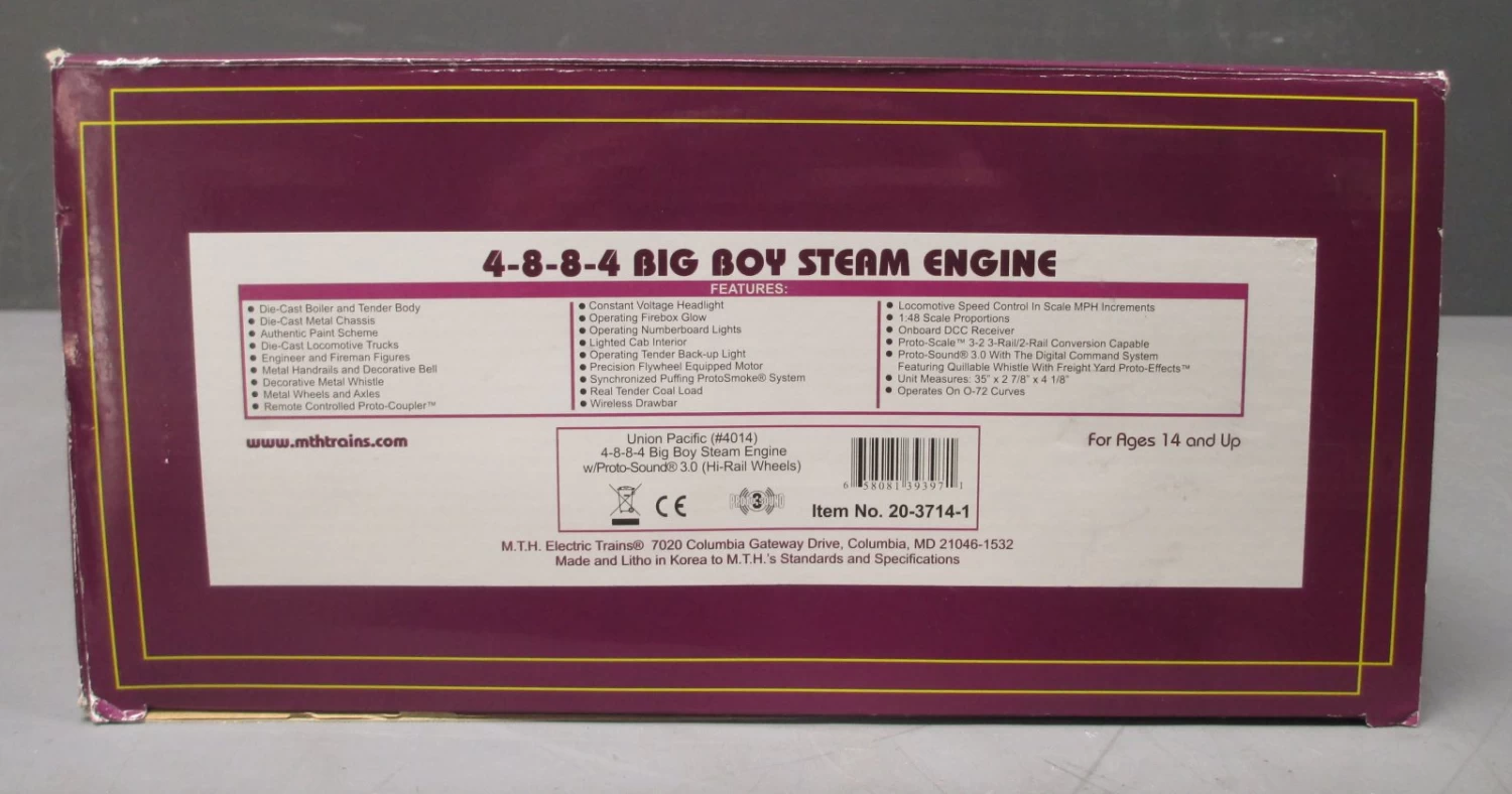 This is a MTH 20-37141 O Union Pacific 4-8-8-4 Big Boy #4014. Die-Cast Boiler and Tender Body. Die-Cast Metal Chassis. Authentic Paint Scheme. Die-Cast Locomotive Trucks. Engineer and Fireman Figures. Metal Handrails and Decorative Bell. Decorative Metal Whistle. Metal Wheels and Axles. Remote Controlled Proto-Coupler. Kadee Coupler Mounting Pads. Prototypical Rule 17 Lighting. Constant Voltage Headlight. Operating Firebox Glow. Operating Numberboard Lights. Lighted Cab Interior. Operating Tender Back-up Light. Precision Flywheel Equipped Motor. Synchronized Puffing ProtoSmoke System. Steaming Whistle With Playable Intensity. Locomotive Speed Control In Scale MPH Increments. Wireless Drawbar. 1:48 Scale Proportions. Onboard DCC Receiver. Proto-Scale 3-2 3-Rail/2-Rail Conversion Capable. Proto-Sound 3.0 With The Digital Command System Featuring Quillable Whistle With Freight Yard Proto-Effects. Unit Measures: 35 x 2 7/8 x 4 1/8