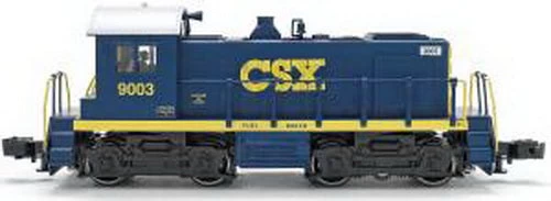 Here is an RMT 92304 O CSX Bang S-4 Powered Diesel Switcher #9003 (3 Rail). This locomotive features plastic body construction, dual motors, metal handrails, operating metal couplers, flashing roof beacon, directional headlights and rear marker lights. For use with most 0/0-27 Gauge 3-rail toy trains.